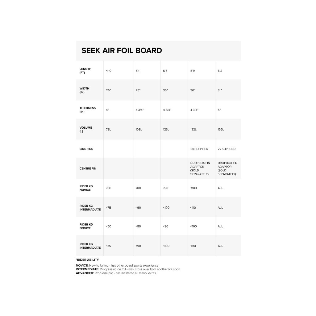 North Seek Air 5’5”(165cm, 123 litrů) – Nafukovací board s pevnou karbonovou platformou s kolejnicí pro uchacení foil nohy. Lze sbalit do podobné velikosti jako paddleboard. Jízdní vlastnosti jsou velmi podobné jako u pevného boardu.
